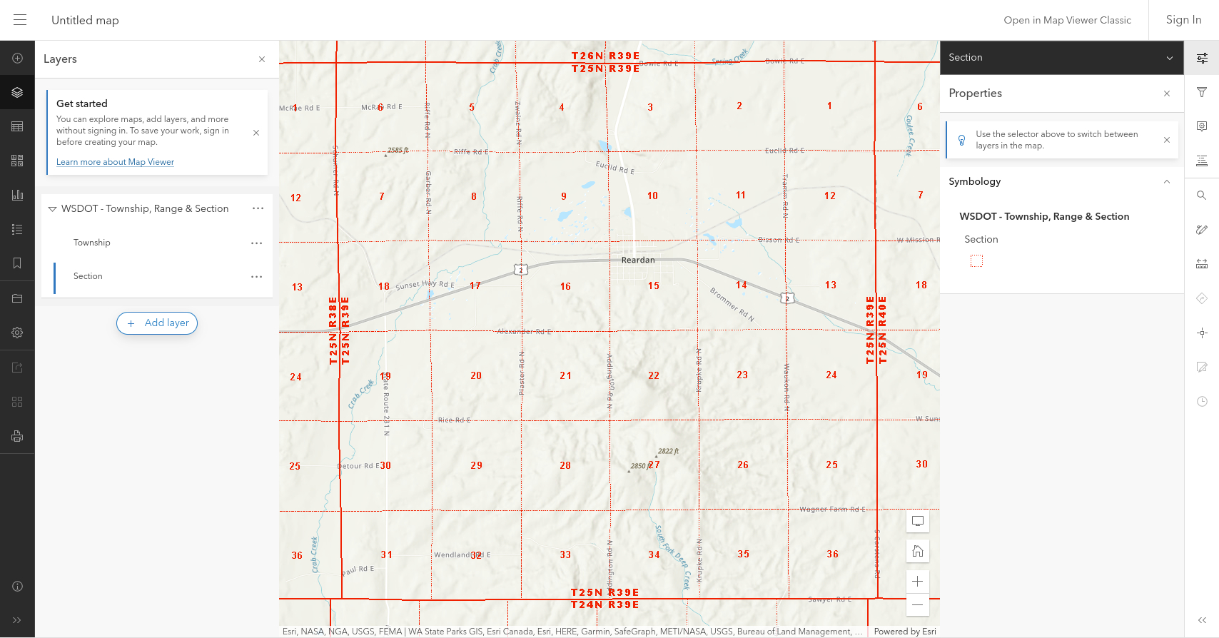 Screen capture of the 2022 arcgis map for T25N R39EWM including Reardan.