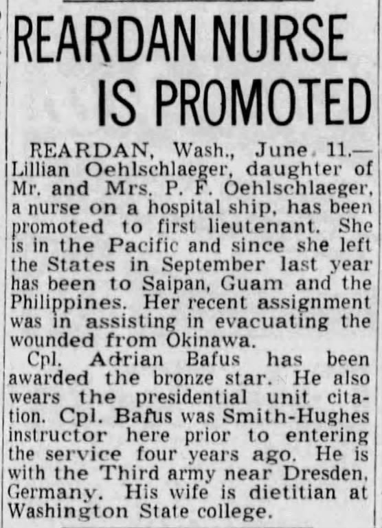 - (download) 1945-06-12-sr-p5-lillian-oehlschlaeger-promoted-adrian-bafus-bronze-star.jpg . . 556 × 769 . . 95 KB . . Kirk . . 10:25, 24 August 2023