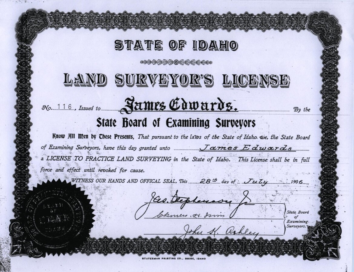- (download) 1906-rml-0247-james-edwards-idaho-surveyor-license-1600.jpg . . 1,170 × 900 . . 364 KB . . Kirk . . 12:48, 23 May 2023