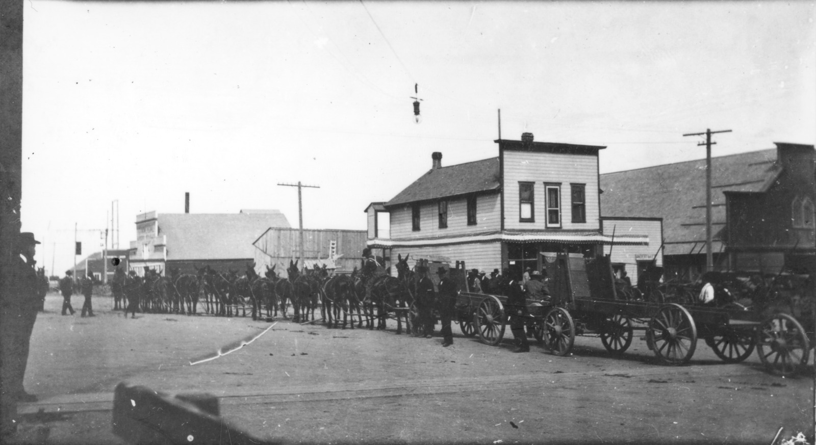 Mule Day parade at Broadway Avenue and Lake Street showing west Broadway Avenue and Hard's Undertaking office to right of corner building. Photo between 1905 and 1914 or around 1912. Photo held by the Lincoln County (Washington) Historic Society.