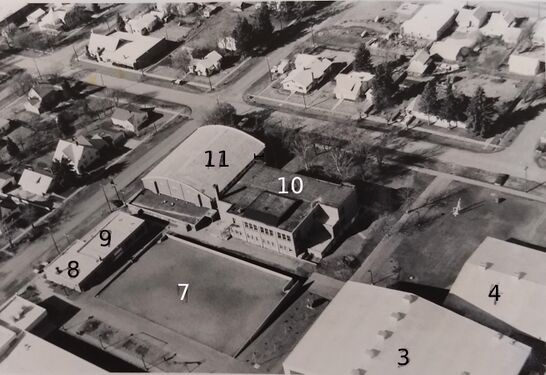 Building 1930 was remodeled to add three class rooms over the old gymnasium, now used as recreation room. Note: - Gym [now Smith Gym] is present - shop part of ag building is present - tennis courts next to 1930 building are present - bus garage on east side of block is present with seven buses - baseball dugout and bleachers present on athletic field - tether ball poles are present on grade school playground - barely visible are swings, slide and merry-go-round on primary playground - near top center is the town library (near where post office is now (c1970-2020)