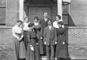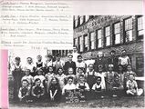 Back Row: Zoe (or Vona) Shoemaker, Grace Sullivan, Mary Schultz, Eva Chillis, Iva Lyle, Lulu Bentley (1911), Charlotte (Lotta) Dueber (1911), W.H. Padley (principal), Thea Bender (teacher), Mr. Stringer (teacher), Walter Ryder, Ernest Davidson (1909), Walter Hinkle (to become a long time and beloved janitor of the school.