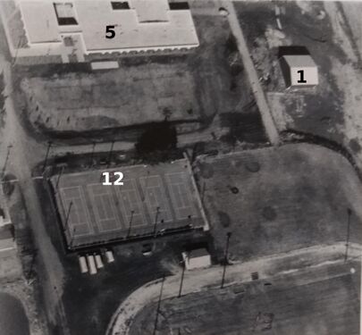 {{<figure src="1980-aerial-view-playground-and-tennis-courts.png" comment="Areial view of grade school expansion (1980) playground, tennis courts, storage/restrooms/concession building and part of track (1974)">}} In the summer of 1974 the football field is expanded to accommodate five tennis courts, a track and a baseball field (which conflict with track and football field). This is now known as the J. B. Johnson Playfield.