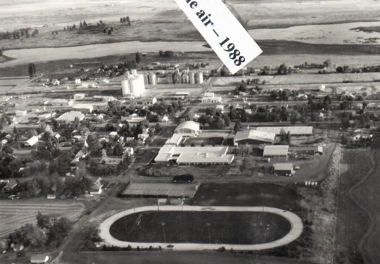 The Aspen Street side of the school looking south at the west side of the Smith Gym, greenhoouse, ag shop and grade school. This was taken after the 1972 addition of the greenhouse to the vocational agriculture building and the 1974 construction of the tennis courts on the Joe Johnson Playground.