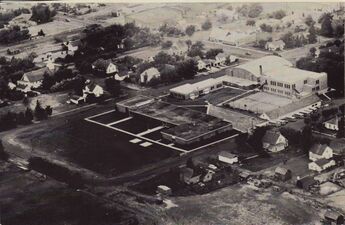 Building 1930 was remodeled to add three class rooms over the old gymnasium, now used as recreation room. Note: - Gym [now Smith Gym] is present - shop part of ag building is present - tennis courts next to 1930 building are present - bus garage on east side of block is present with seven buses - baseball dugout and bleachers present on athletic field - tether ball poles are present on grade school playground - barely visible are swings, slide and merry-go-round on primary playground - near top center is the town library (near where post office is now (c1970-2020)