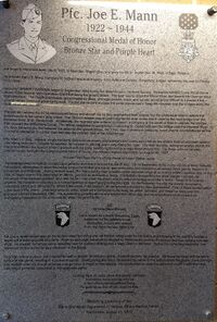 "Acting as lead scout, Pfc. Mann crept to within rocket launching range of an enemy artillery position and in the face of heavy fire, destroyed an 88mm gun and an ammunition dump. He remained exposed, and with his M-1 rifle killed the enemy, one by one, until he was wounded four times."Taken to a covered position, he insisted on returning to his forward position to stand guard during the night. The enemy attacked in the morning and a hand grenade landed with in a few feet of Pfc. Mann. Unable to raise his arms, which were bandaged to his body, he called 'grenade,' threw his body over the grenade and, as it exploded, died.
