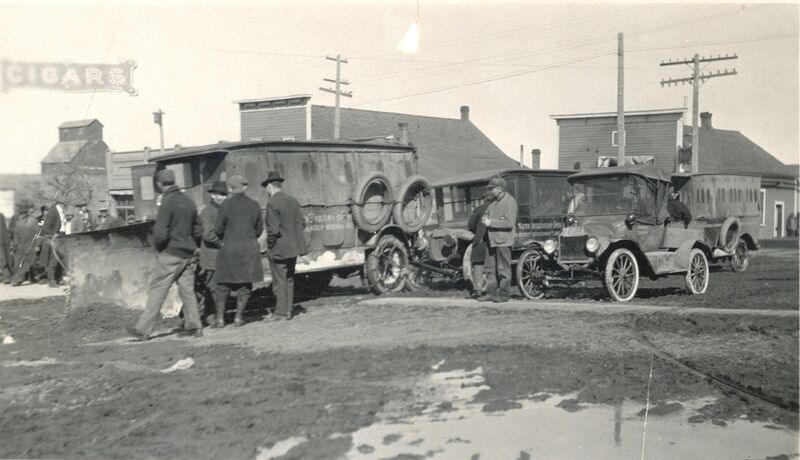 This appears to be three buses with the lead bus towing the other two. The lead bus is also equipped with a V-plow and extra tires. There are several men around the buses, so this appears to be some sort of planned event. The Model-T on the right has the words "Spokane County" painted on their door. This appears to be an early sheriff's car, but it is well out of its jurisdiction. It also appears to be the spring of the year with meltwater and possibly some snow in the photo. So what is going on here?