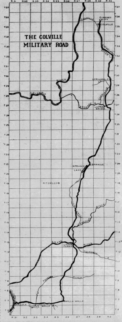 In the 1860s and 1870s the Colville military road from Walla Walla and Wallula continued to be the principal means by which the Colville valley and Fort Colville were supplied with merchandise and military requirements from the outside world. Some freight was hauled from White Bluffs, but most of the freight wagons were operated by men who had their homes either in the Colville valley or in the Walla Walla country, and they preferred the older route across the Snake river and thence northward.