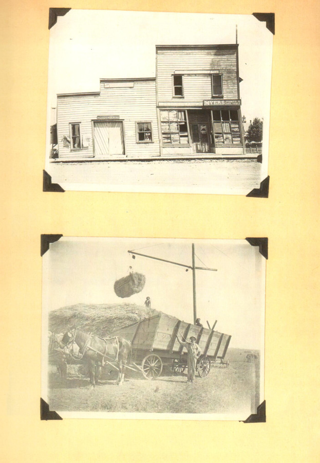 page 22 of Clayton scrapbook: bent building (Raymer hardware store), Jackson fork unloading header box