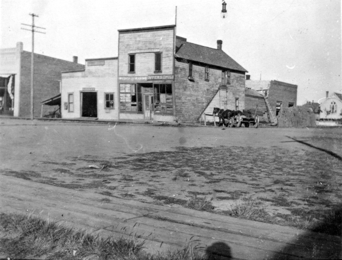 Raymer's hardware between 1890 and 1905. South side stair case and front porch are missing. Windows appear to be broken and boarded up. Building has signs for John Deere plows, Glidden barbed wire, paint, Myers Pumps, Weber Wagons, an automobile and motorcycle race, some type of engines. Photo held by the Lincoln County (Washington) Historic Society.