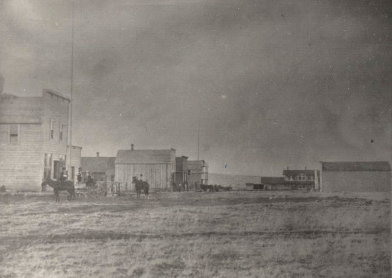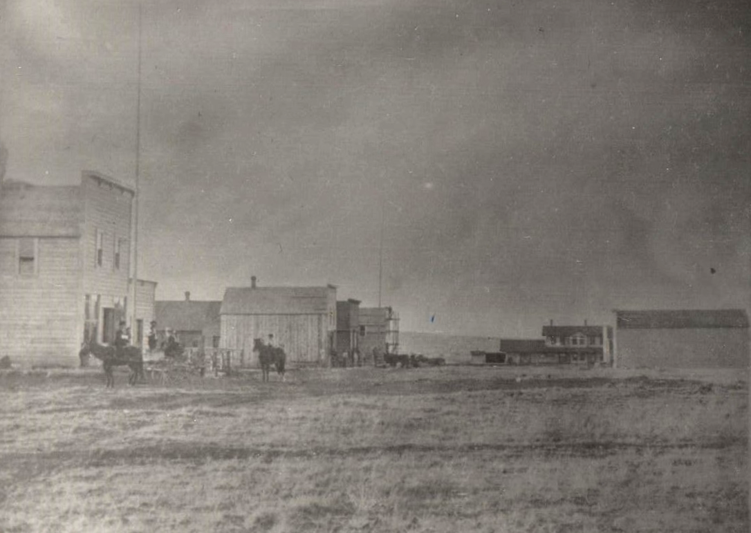 Poor copy of early photo of Reardan looking north on Lake Street. Shows depot, Reardan Hotel with scaffolding, and store NW corner of Lake and Broadway under construction. (Held by the Reardan Memorial Library)
