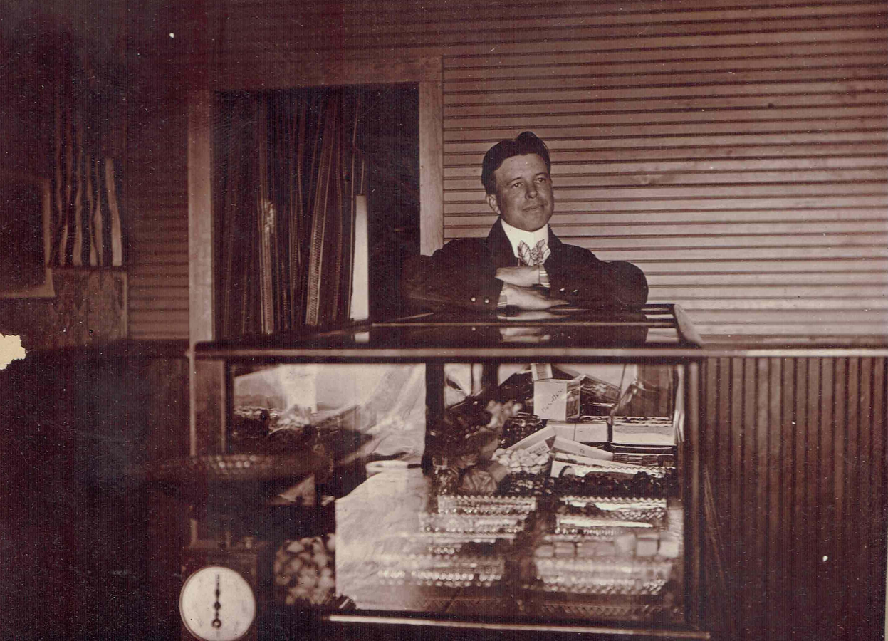 Ralph Sullivan and cigar showcase at Sullivan's Smokehouse (about 1910). (Photo held by the Reardan Memorial Library.)