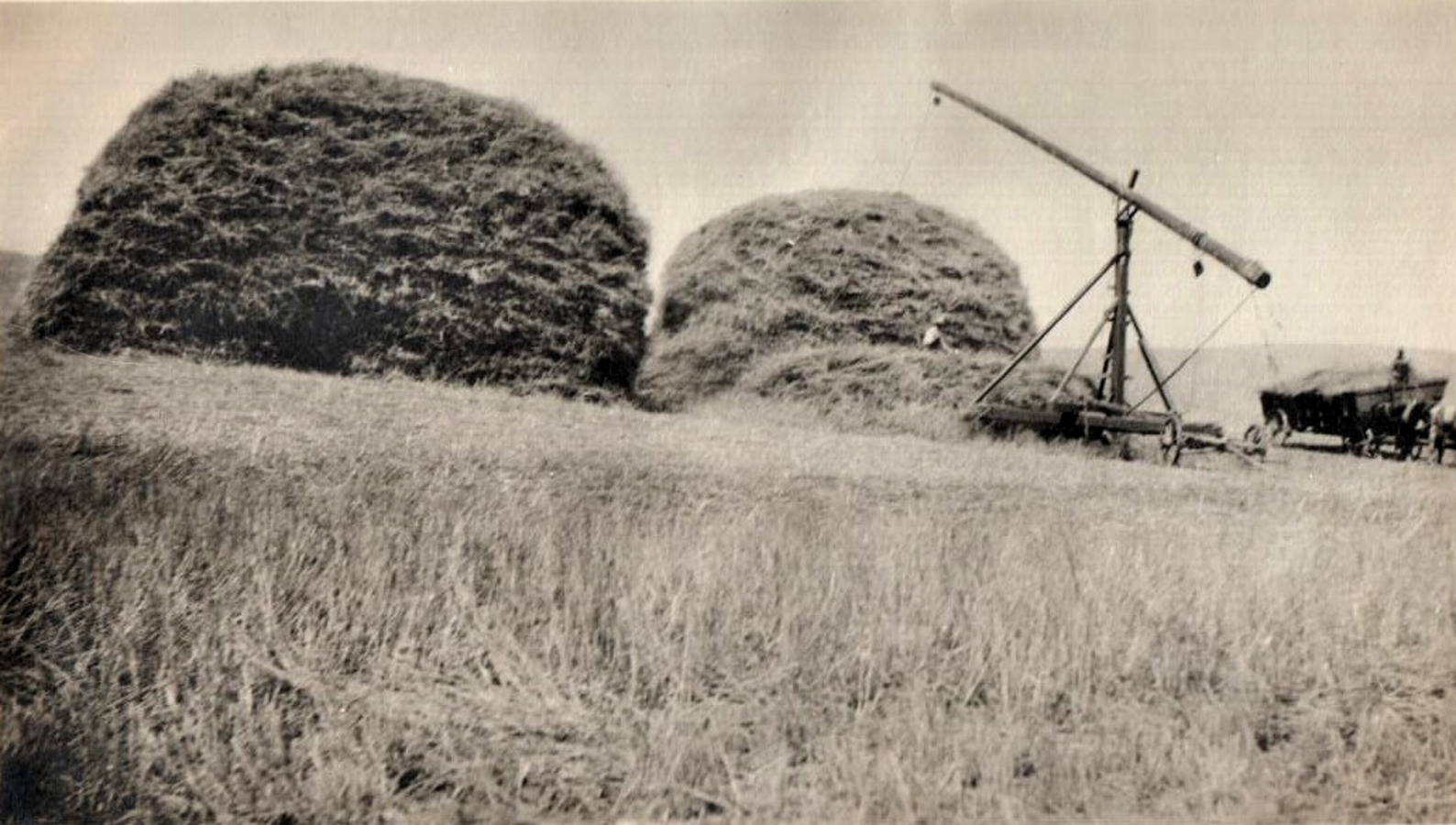 Henry Mahrt reaped wheat stacks, jacson fork and header box. (Image held by the Reardan Memorial Library.)
