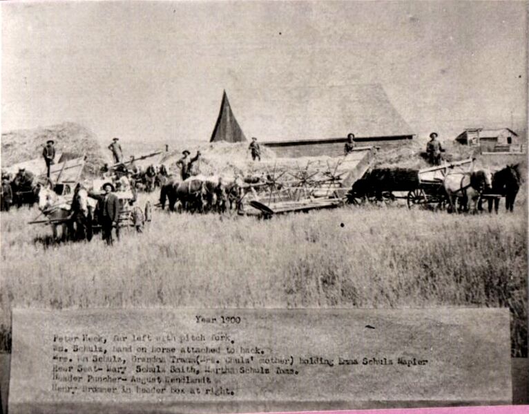1900. Header boxes, family hack, and reaped grain. Peter Haack, far left with pitch fork. Wm. Schulz with hand on horse attached to hack. Front seat of hack: Mrs. William Schulz [Bertha Tramm], Gramdma Tramm [Mrs. Shultz's mother, Mrs. Peter Tramm or Mary] holding Emma Schulz Napier. Rear seat of hack: Mary Schulz Smith and Martha Schulz Toms. Header Puncher: August Wendlandt. Henry Brommer in header box at right. (Image held by the Reardan Memorial Library.)