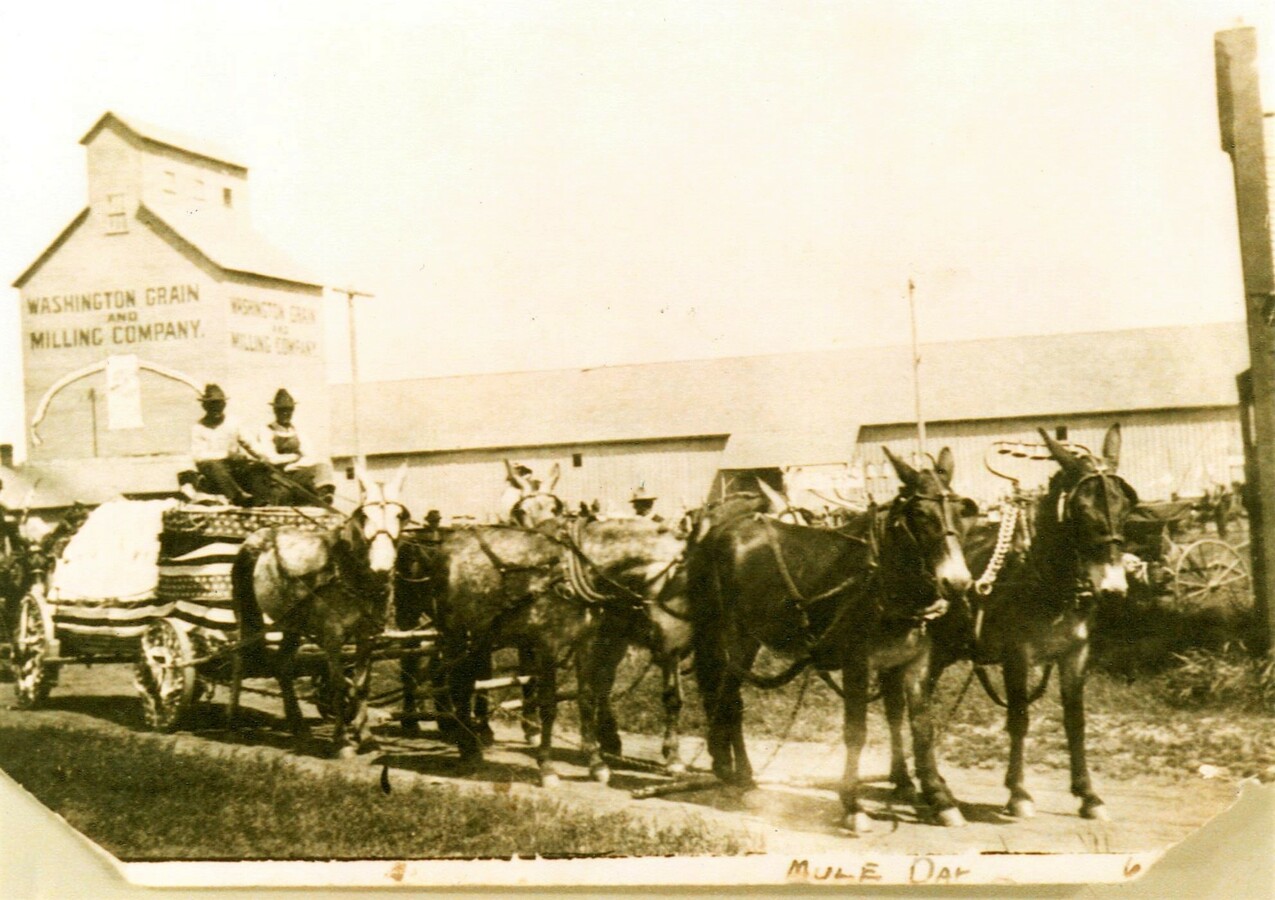 This page is from a scrapbook held by the Reardan Memorial Library about the Reardan Mule Days. 005 mule day parade, wagon, milling, Broadway