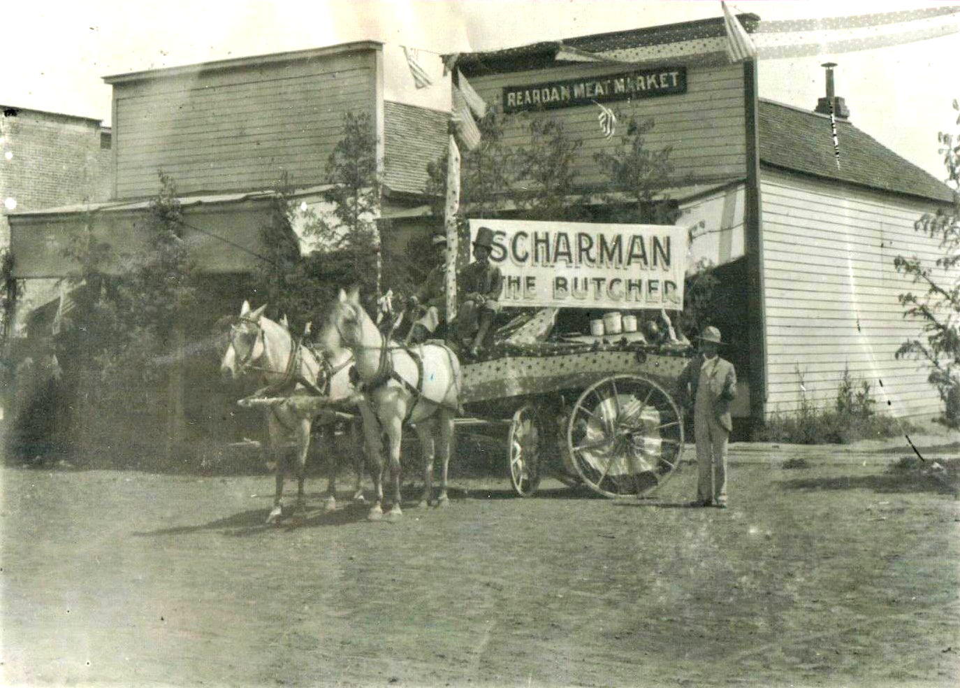 Scharman Meat Market wagon based float in front of old meat market. (Photo part of the Mule Day collection of the John Mann family held by the Reardan Memorial Library