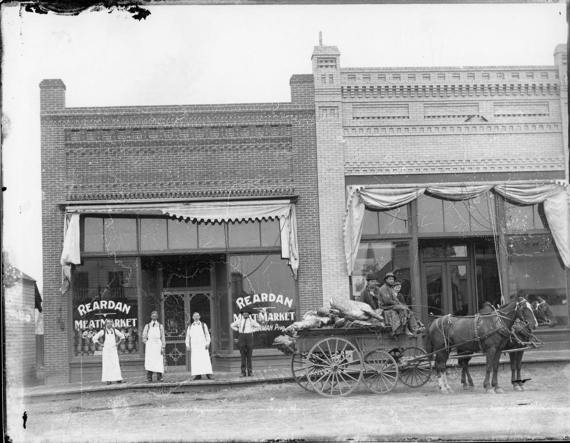 Wagon with carcasses in front of brick Reardan Meat Market and Raymer's brick store. Have seen this before but not cataloged. (photo from Carol Anderson Paul collection)
