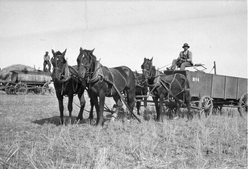 Straw wagon, water wagon, grain wagon, Otto on left (Photo by Otto Mahrt)