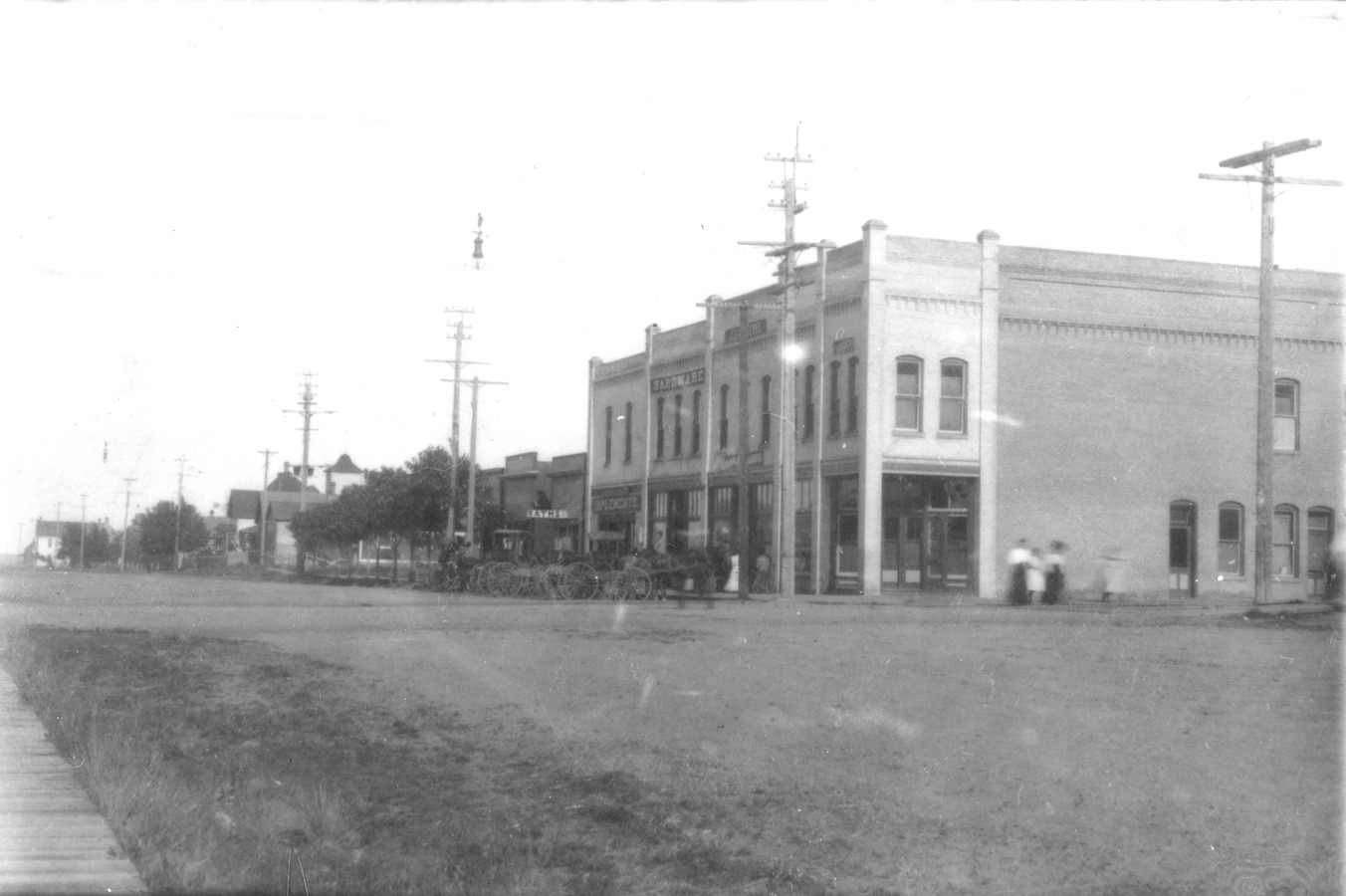 Stevenson Block locking east on Broadway Avenue. Driscoll was in the store from 1904 until about 1932. Building was built by Thomas Stevenson. Possibly first school on horizon. Photo held by the Lincoln County (Washington) Historic Society.