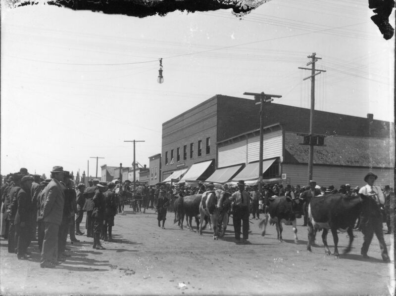 Mule day parade on Lake street. Boys in bloomers. Bentley and Rexall sign on Bowie Block. No Reardan General Hospital sign. Clear version of 1907-mule-day-016-parade-lake-street-south-1600.jpg. (photo from Carol Anderson Paul collection)