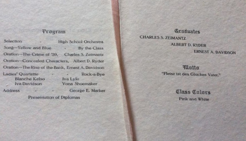 1909 06 RHS graduation program. (From Facebook.)ProgramSelection--High School OrchestraSong--Yellow and Blue--by the ClassOration--The Crime of '59--Charles S. ZeimantzOration--Concealed Characters--Albert D. RyderOration--The Rise of the Bank--Earnest A. DavidsonLadies' Quartet--Rock-a-Bye* Blanch Kelso* Iva Lyle* Iva Davidson* Vona ShoemakerAddress--George R. MarkerPresentation of DiplomasGraduates* Charles S. Zeimantz* Albert D. Ryder* Earnest A. DavidsonMottoFletsz