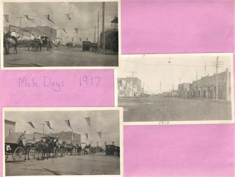 This page is from a scrapbook held by the Reardan Memorial Library about the Reardan Mule Days. 020 mule day parade on Lake street with flag pole