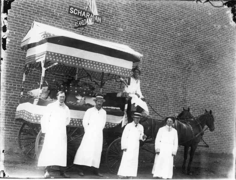 Scharman Meat Market float for mule day parade. Similar to 1910-1918-mule-day-021a-float-meat-market-geo-reeves-conrad-scharman.JPG. (photo from Carol Anderson Paul collection)