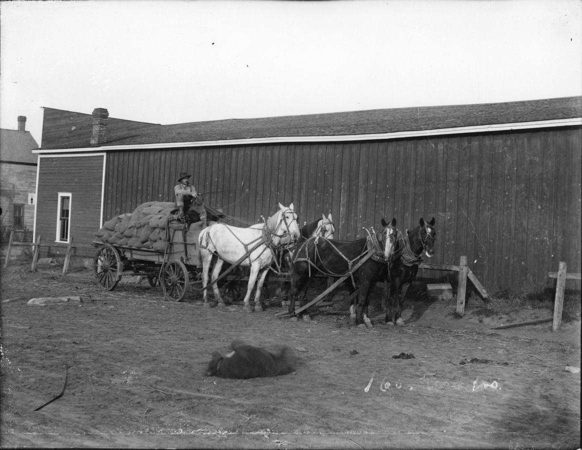 Wagon load of grain beside Mattes' Lumber. Clearer version of 1910-1920-rml-0134a-by-mattes-lumber-yard-se-spokane-lake-1600.jpg. Raymer store is in the background. (photo from Carol Anderson Paul collection)