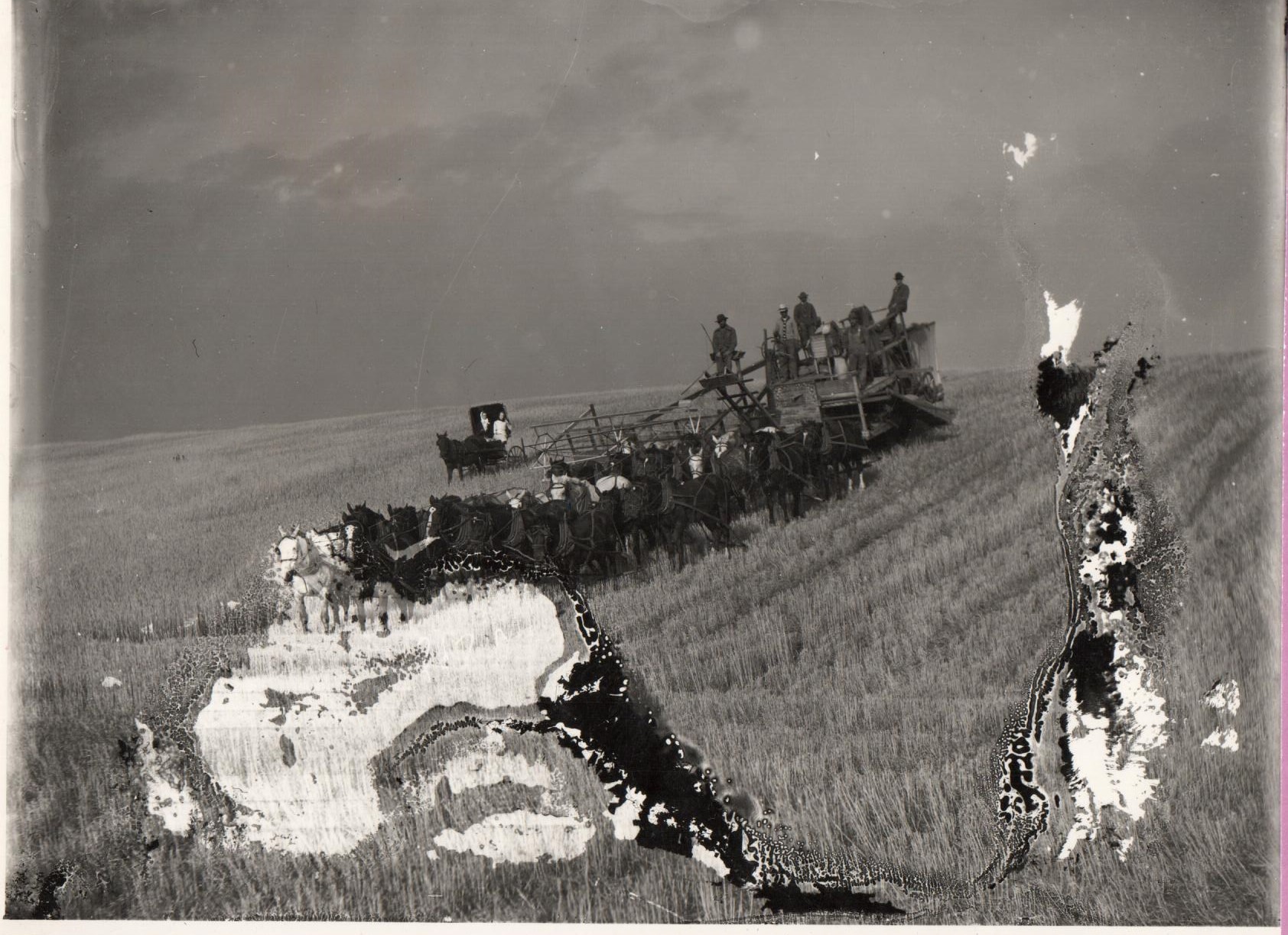 Horse drawn combined harvester between 1910 and 1920 (Image held by the Reardan Memorial Library.)
