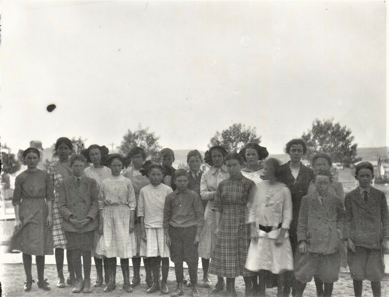 1910-1920-RGS class fourth-sixth grade?, young trees and elevators in background (facing north?). Boys with bloused trousers. (Photo held by the Reardan Memorial Library.)