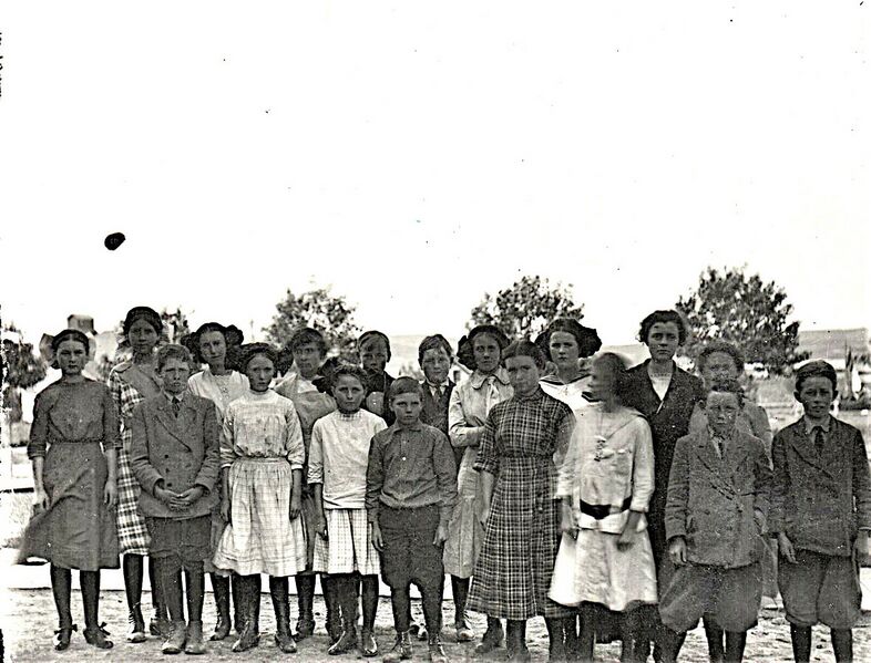 1910-1920-RGS class fourth-sixth grade?, young trees and elevators in background (facing north?). Boys with bloused trousers. (Photo held by the Reardan Memorial Library.)