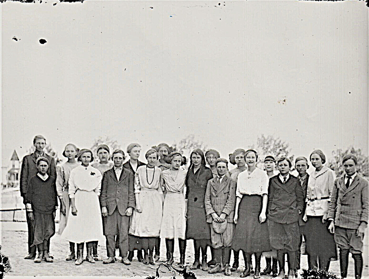 1910-1920-RGS class, seventh-eighth grade, young trees and house/church with spire in background (facing north?). Boys with bloused trousers. (Photo held by the Reardan Memorial Library.)