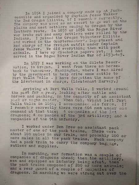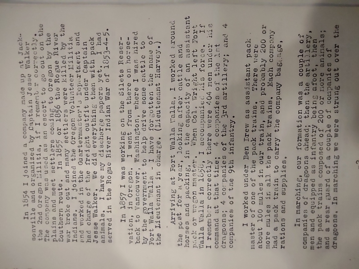 Part of the reminisces of John Smith captured by William Lewis, traveling secretary of the Spokane Historic Society. This is a photograph of a photocopy. (This is held by the Spokane Public Library.)