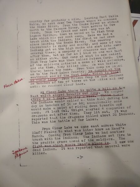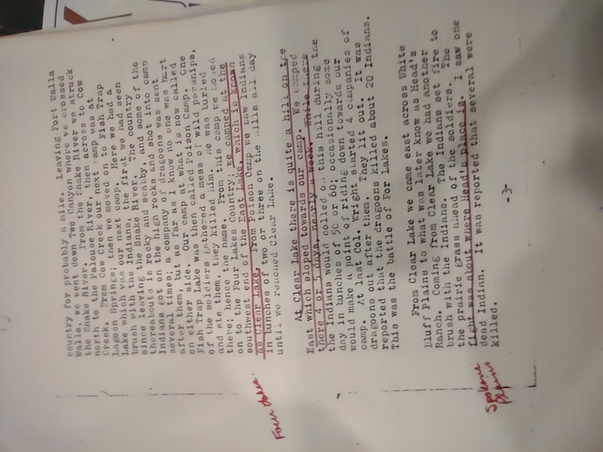 Part of the reminisces of John Smith captured by William Lewis, traveling secretary of the Spokane Historic Society. This is a photograph of a photocopy. (This is held by the Spokane Public Library.)