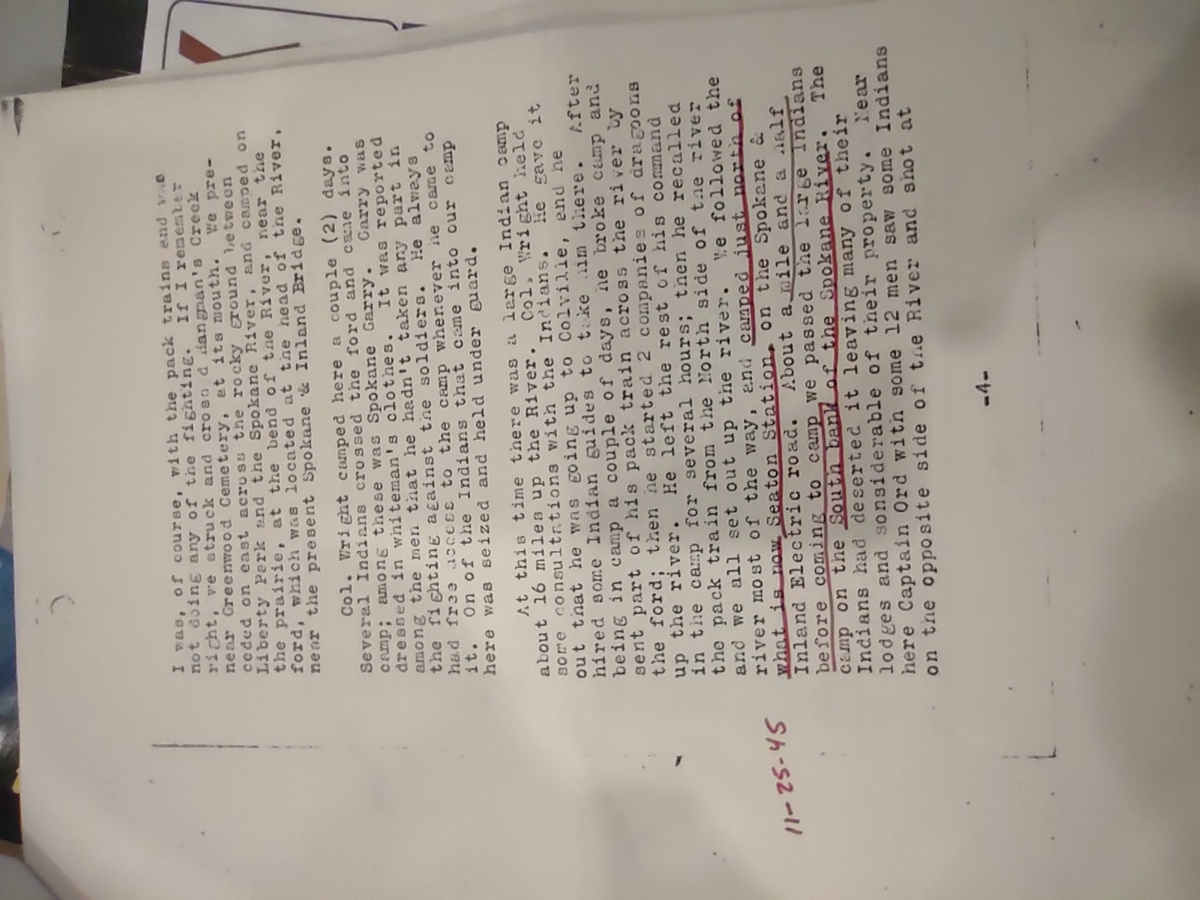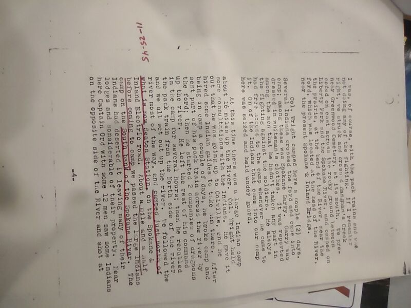 Part of the reminisces of John Smith captured by William Lewis, traveling secretary of the Spokane Historic Society. This is a photograph of a photocopy. (This is held by the Spokane Public Library.)