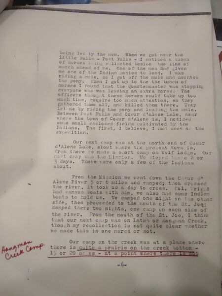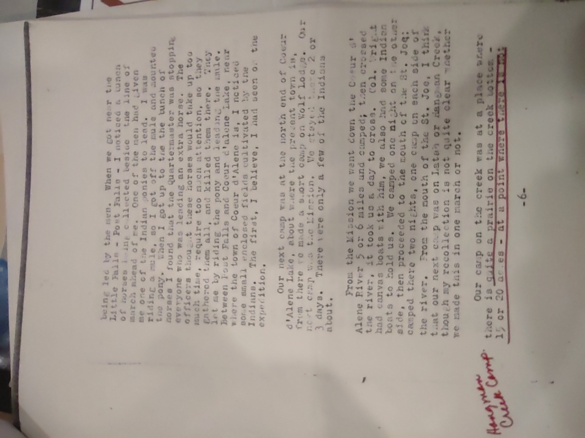 Part of the reminisces of John Smith captured by William Lewis, traveling secretary of the Spokane Historic Society. This is a photograph of a photocopy. (This is held by the Spokane Public Library.)