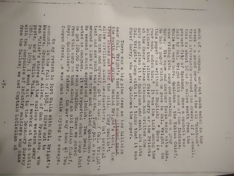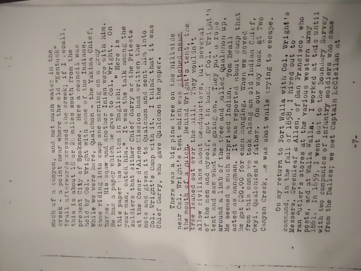 Part of the reminisces of John Smith captured by William Lewis, traveling secretary of the Spokane Historic Society. This is a photograph of a photocopy. (This is held by the Spokane Public Library.)