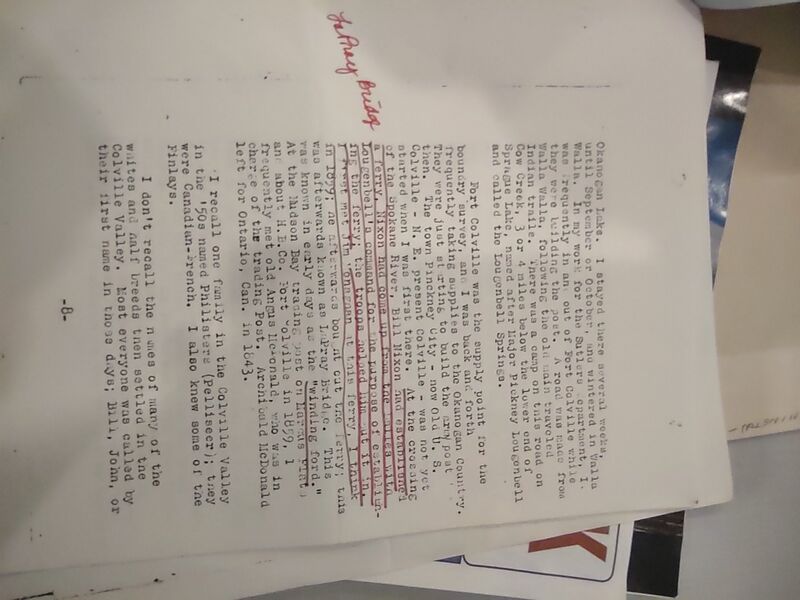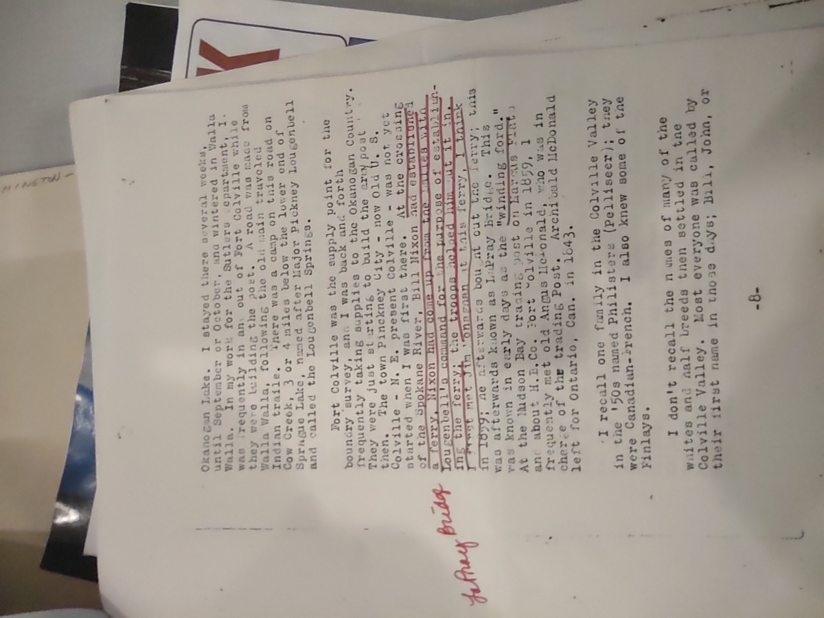 Part of the reminisces of John Smith captured by William Lewis, traveling secretary of the Spokane Historic Society. This is a photograph of a photocopy. (This is held by the Spokane Public Library.)