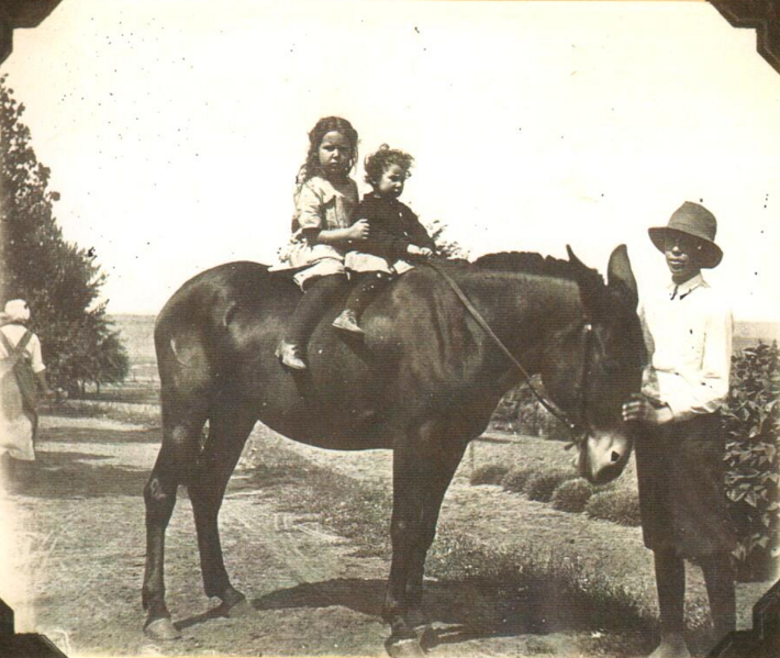Agnes Driscoll and Elizabeth Raymer on mule lead by Harry Tramm about 1912 or 1913