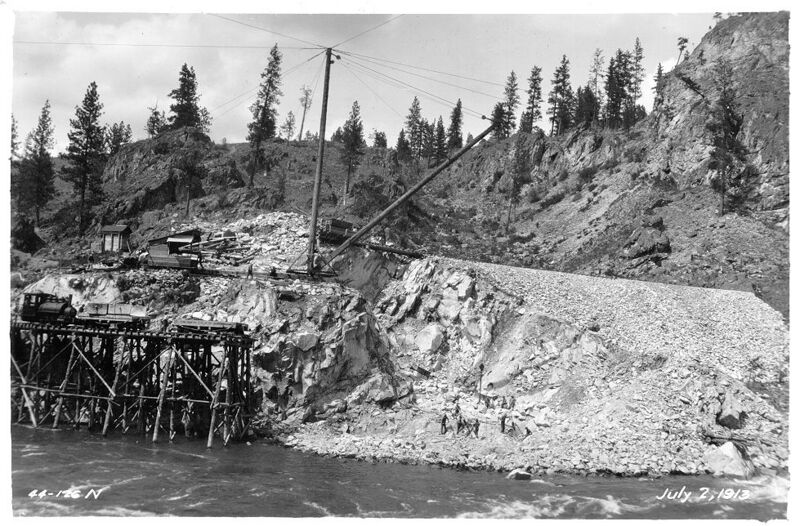 Working in river channel. (Photos by Washington Water Power Company, now Avista and harvested from Big Bend Railroad history [1])