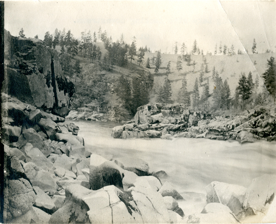 Long Lake dam site down stream 12. (Photo by Otto Wollweber.) (Photo from Spokane Public Library.)