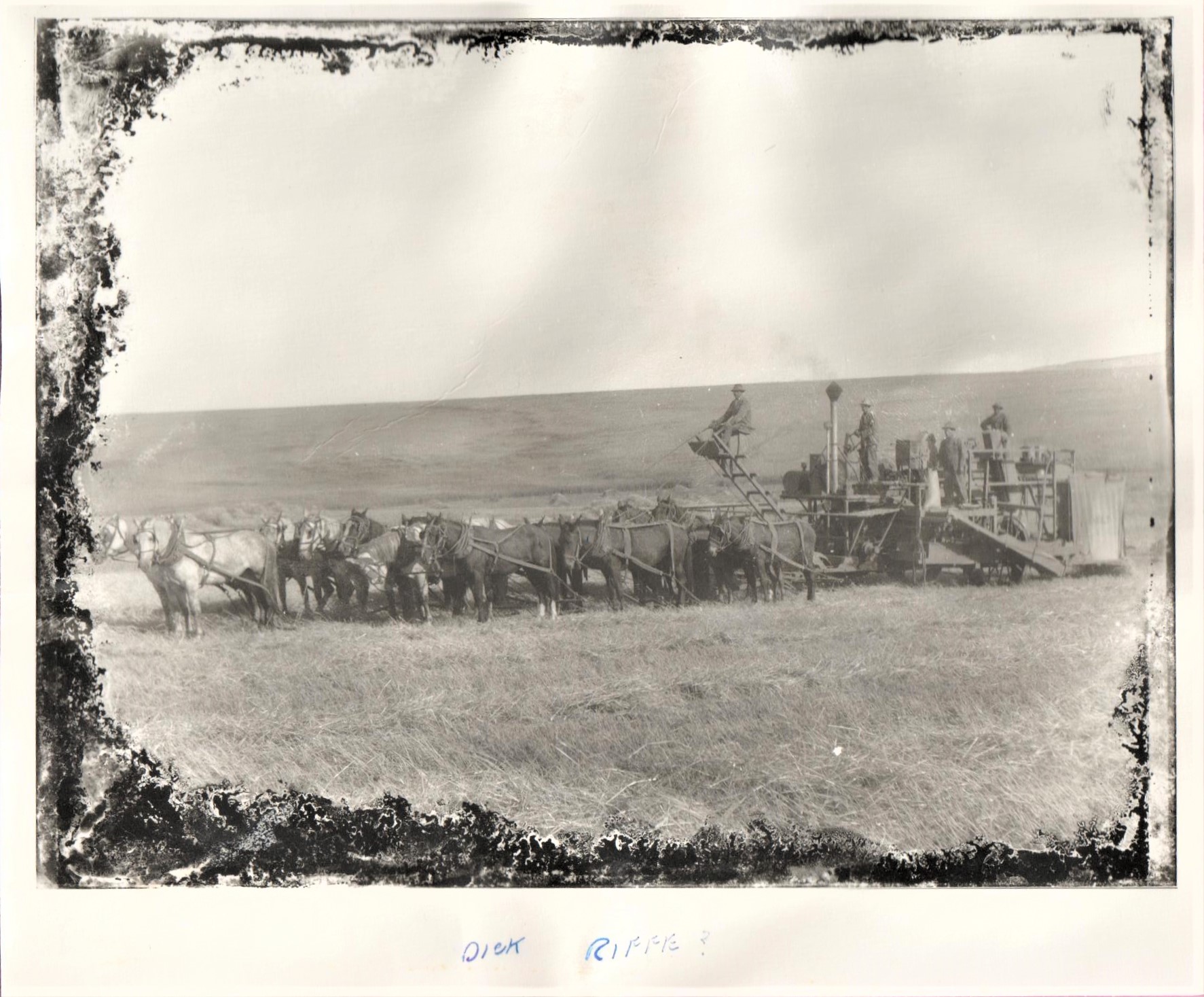 Horse drawn gasoline powered combined harvester. (Image held by the Reardan Memorial Library.)