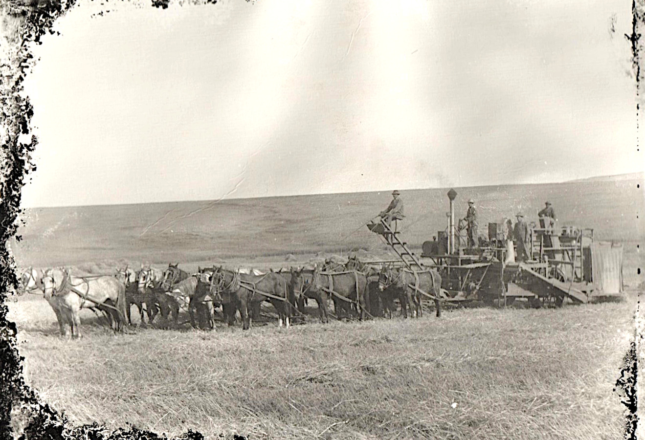 Horse drawn gasoline powered combined harvester. (Image held by the Reardan Memorial Library.)