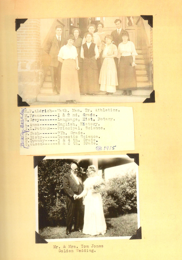 page 16 of Clayton scrapbook: 1915 Reardan teachers and Tom Jones 50th wedding anniversary