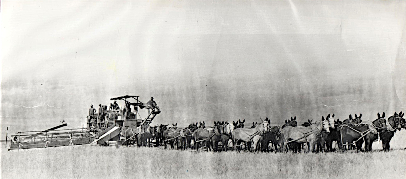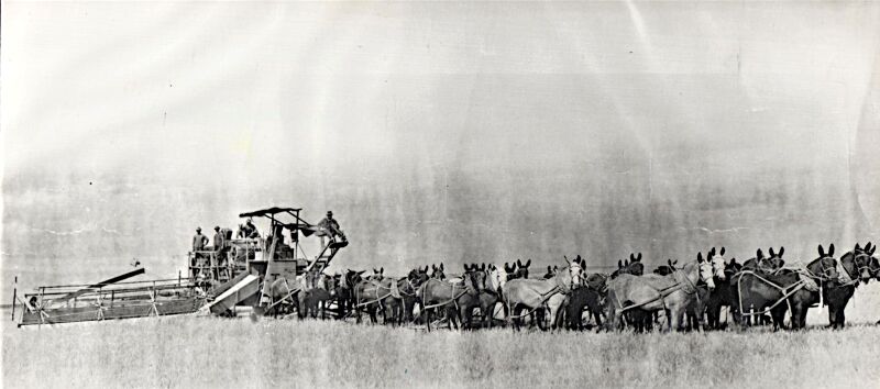 Horse drawn combined harvester. (Image held by the Reardan Memorial Library.)