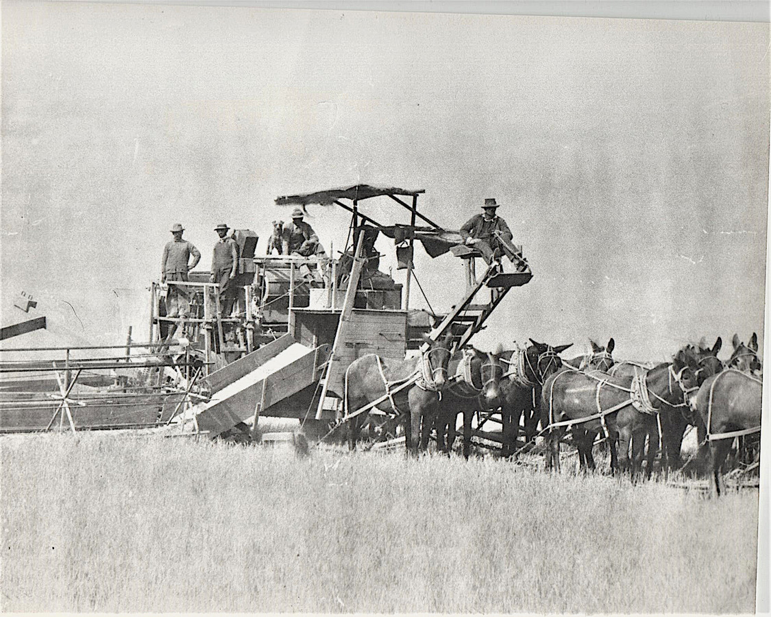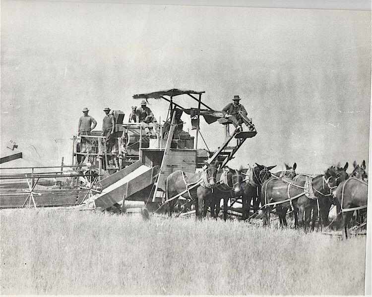 Horse drawn combined harvester. (Image held by the Reardan Memorial Library.)