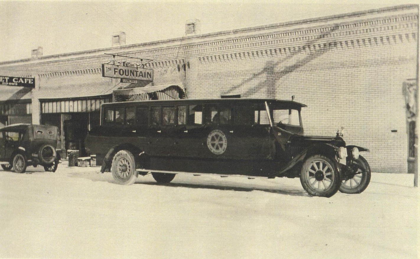 Interurban Bus on Broadway avenue in front of the Mattes building (Sunset Cafe, Fountain are visible). (Held by the Reardan Memorial Library)