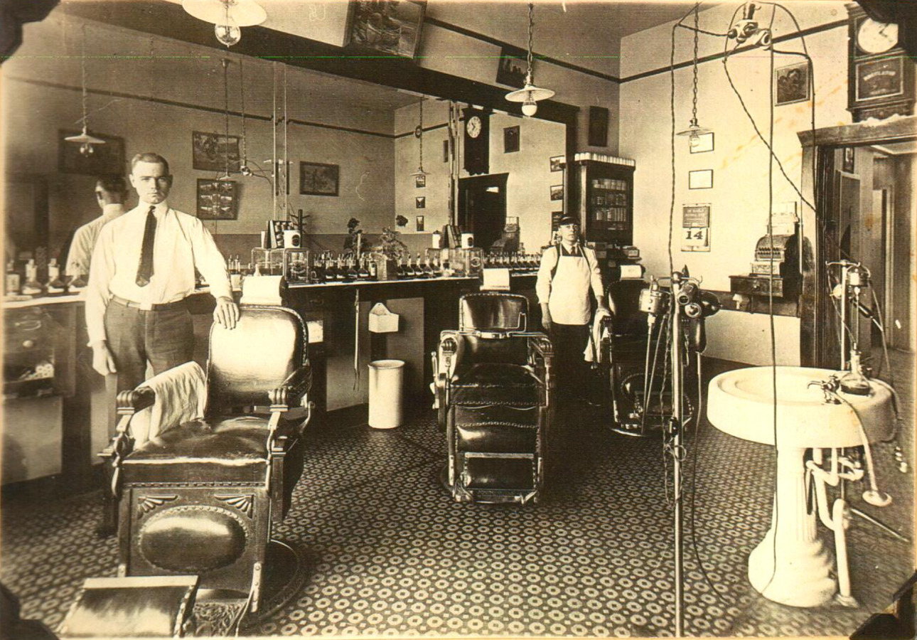 1923 barbershop (north side of Mattis building) with Ray Warren and Hans Iller
