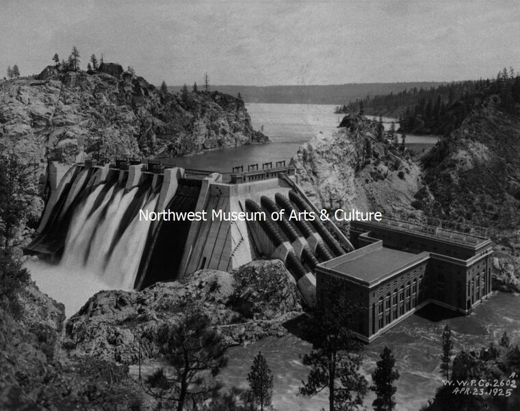 Long Lake Dam, spillway and powerhouse in 1925. The fourth unit is partially installed based on the penstock. (Photo held by the Mac.)