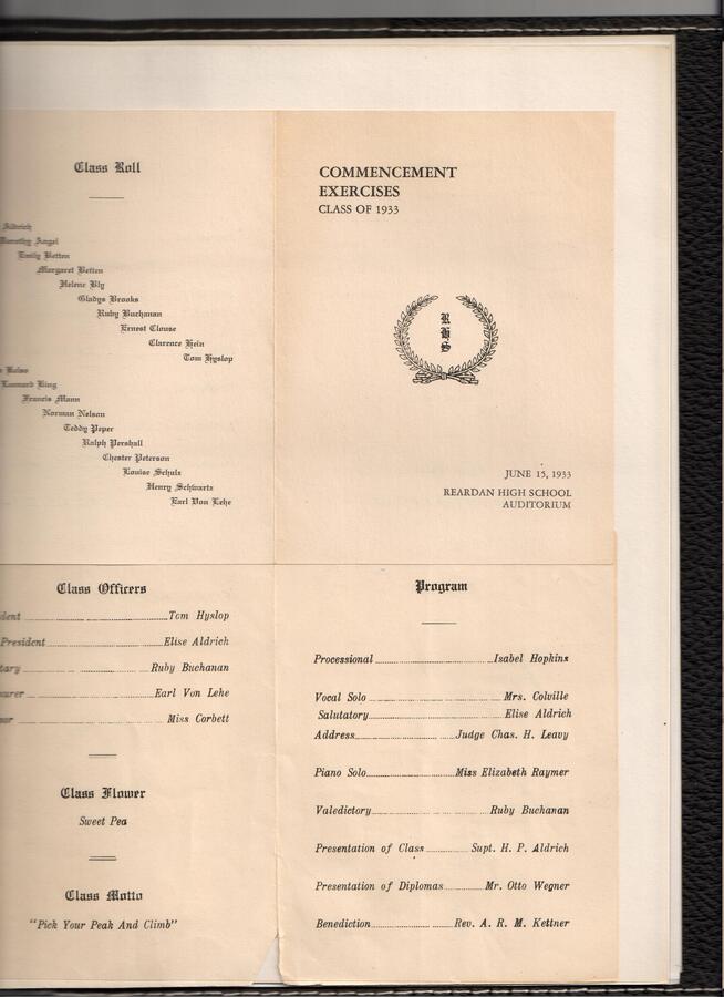 1933 commencement program. (Photo held by the Reardan Memorial Library.)